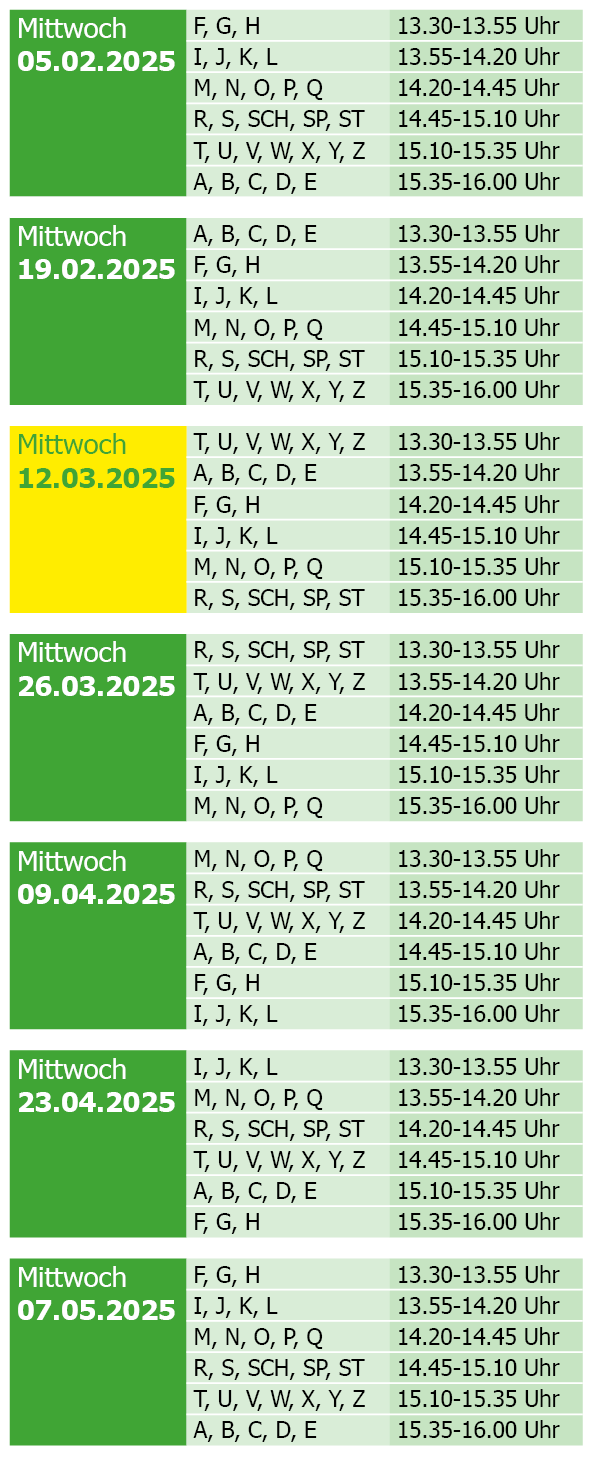 Bitte beachten Sie, dass Sie zu unterschiedlichen Zeiten an der Reihe sind.